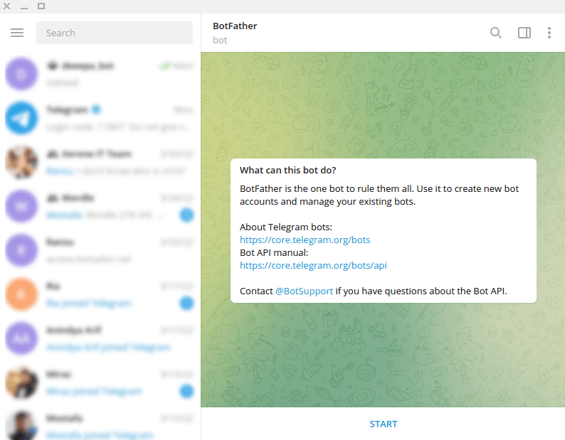 To build a Telegram bot with AutoVo, first, open your Telegram App. Then in the search bar of the app, search with the ‘BotFather’ keyword. Then select the verified BotFather account.